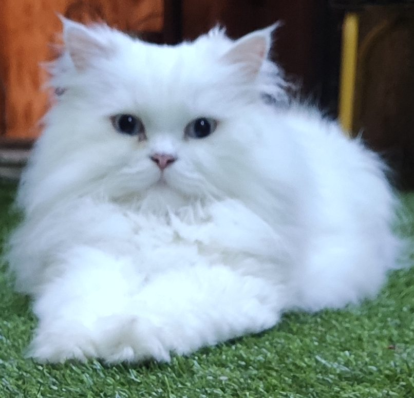 Persan chinchilla mâle, Bergamote est né le 20 avril 2020 et pèse 4.1kgs. Il a comme son tonton une magnifique robe blanche immaculée comme un nuage : court sur pattes et tout dodu, il reste très vif et adore jouer. Sa maman se prénomme Romy et son papa Minuit. C’est un grand charmeur, et il vous envoûte avec ses magnifiques yeux bleus dans-lesquels tout le monde se noie, sans exception…il ronronne à tout-va et adore les câlins…C’est le petit dernier de la bande, et comme tout dernier, Bergamotte multiplie les bêtises, même s’il a encore besoin d’être rassuré par ailleurs, en se lovant entre nous deux ou en appelant les copains dès qu’il ne les voit plus. Son péché mignon : le beurre…et plein d’autre choses…c’est un gourmand !!!